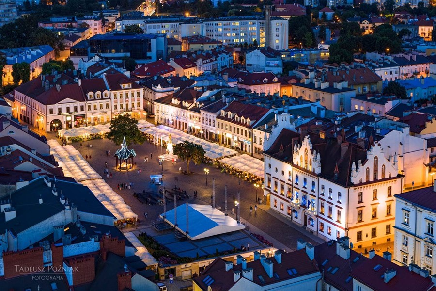 Wielkie rozkładanie parasoli na rynku w Rzeszowie