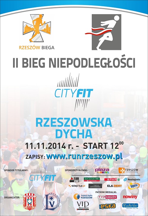 11 listopada, we wtorek, w samo południe wystartuje II Bieg Niepodległości – Rzeszowska Dycha. To ostatnia z trzech imprez organizowanych w ramach projektu Rzeszów BIEGA 2014, po półmaratonie i maratonie.Chętni, którzy zdecydują się na przebiegnięcie 10 km, wystartują z placu przy klubie fitness CITYFIT przy ul. Rejtana.