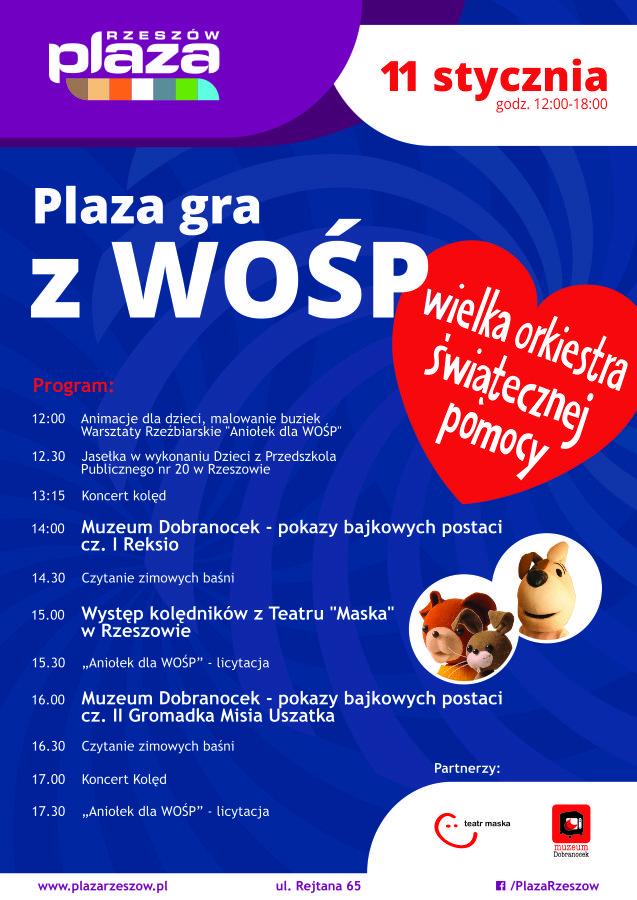 W CH Plaza o godzinie 12:00 rozpoczną się warsztaty rzeźbiarskie dla dzieci "Aniołek dla WOŚP". Wykonane aniołki będą przedmiotem licytacji na rzecz WOŚP o godz. 15.30 i 17.30. O 12.30  - jasełka w wykonaniu Dzieci z Przedszkola Publicznego nr 20 w Rzeszowie. CH Plaza Rzeszów zaprasza także na specjalny program przygotowany przez „Muzeum Dobranocek” w Rzeszowie. O godzinie 14:00 i 16:00 wszystkie dzieci będą mogły poznać Reksia oraz Misia Uszatka. Pracownicy Muzeum Dobranocek opowiedzą, jak powstawały polskie bajki. Przewidziano także konkursy z nagrodami. Dodatkowo o godzinie 14:30 i 16:30 odbędzie się czytanie zimowych bajek i baśni, a o godzinie 15:00 występ kolędników z Teatru "Maska" w Rzeszowie. Na zakończenie koncert kolęd w wykonaniu zespołu wokalno-instrumentalnego „Młody Duch”.