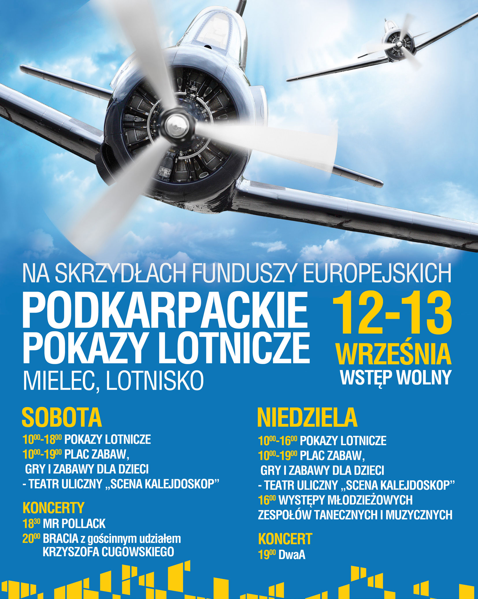 Pokazom lotniczym towarzyszyć będzie impreza plenerowa na mieleckim lotnisku. Zobaczymy Krakowski Teatr Uliczny „Scena Kalejdoskop” słynący z pięknych widowisk ulicznych, Mielecką Orkiestrę Dętą SCK, Zespół Tańca Nowoczesnego „Street Dance” i „Breakdance”, Zespół Taneczny „Tęczowa Gromada” i Zespół Pieśni i Tańca „Rzeszowiacy”. Z koncertami wystąpią zespoły: Mr Pollack, Bracia i Krzysztof Cugowski oraz DwaA. Imprezę poprowadzi Radek Brzózka.