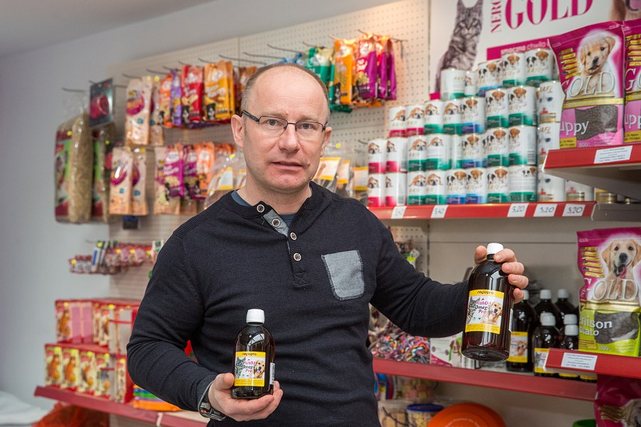 - Hitem, który wprowadziliśmy w ubiegłym roku jest olej z ryb morskich - łososia (85 proc.) i makreli (15 proc.), który sami produkujemy i sprzedajemy pod marką FishOil OmegaPro - mówi Dariusz Nycz. - To produkt, który znalazł już odbiorców w 22 krajach Europy. Dawniej babcie dawały wnuczkom codziennie tran do wpicia, aby poprawić dziecięcą odporność. W oleju z łososia znajduje się witamina Ai E, witaminy z grupy D i K oraz kwasy Omega 3 i 6 we właściwych proporcjach. Nasz olej jest surowy, nieoczyszczony i dlatego też tak bardzo psom smakuje. Nie ma w nim żadnych konserwantów. Może być przechowywany do 6 miesięcy, w temperaturze do 20 st. W miejscu zacienionym. Najlepiej przechowywać go w lodówce.