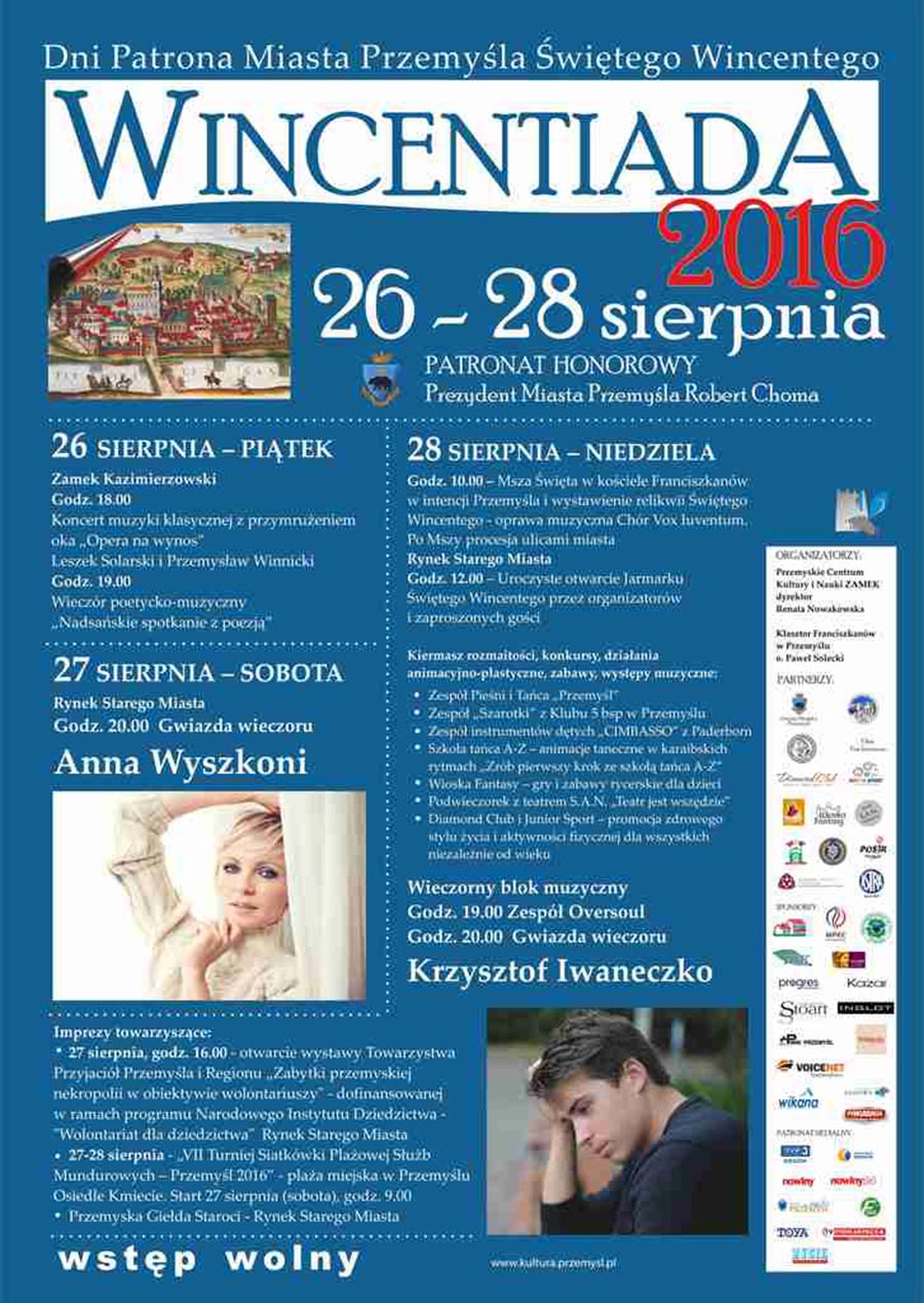 Koniec lata w Przemyślu to Tradycyjnie „Wincentiada”, czyli Dni Patrona Miasta Przemyśla Świętego Wincentego. Tak jak zawsze, ulicami miasta przejdzie procesja z relikwiami Świętego Wincentego, potem będą: konkursy, zabawy dla dzieci i dorosłych oraz wiele innych atrakcji. W piątek, 27 sierpnia na Zamku Kazimierzowskim odbędzie się spektakl muzyczny zatytułowany „Opera na wynos”, w sobotę wystąpi Anna Wyszkoni, natomiast w niedzielę zespół Oversoul oraz przemyślanin Krzysztof Iwaneczko, zwycięzca VI edycji The Voice of Poland.