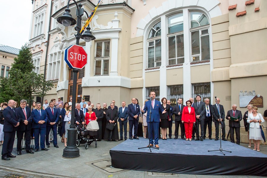 Na szczęście, można powiedzieć, bo w piątkowe popołudnie już mało kto wierzył, że festiwalowemu korowodowi uda się przejść ulicami Rzeszowa, które tonęły w strugach deszczu, a nad miastem przechodziła  gwałtowna burza. Uroczyste otwarcie opóźniło się o pół godziny, ale rzeszowianie nie zawiedli i pojawili się na powitaniu Polonusów oraz otwarciu ulicy. Było oficjalne przecięcie wstęgi i poświęcenie deptaka przez biskupa Jana Wątrobę. Na uroczystości nie zabrakło też wojewody podkarpackiej Ewy Leniart, marszałka województwa Władysława Ortyla oraz prof. Tadeusza Markowskiego, rektora Politechniki Rzeszowskiej, gdzie od lat organizowane jest Festiwalowe Miasteczko.