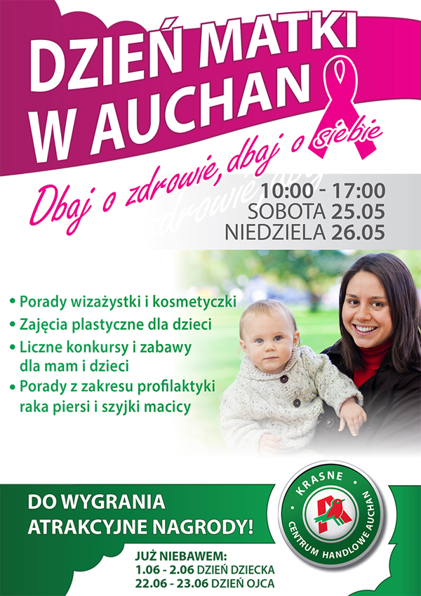 Cykl imprez rodzinnych z zabawami i konkursami rusza w Centrum Handlowym Auchan w Krasnem koło Rzeszowa. Już 25 i 26 maja odbędzie się pierwsze weekendowe wydarzenie - „Dzień Matki z CH Auchan”. Na Panie czekają profesjonalne porady dotyczące dbania o urodę i zdrowie, a dzieci będą miały okazję przygotować oryginalną laurkę dla mam.