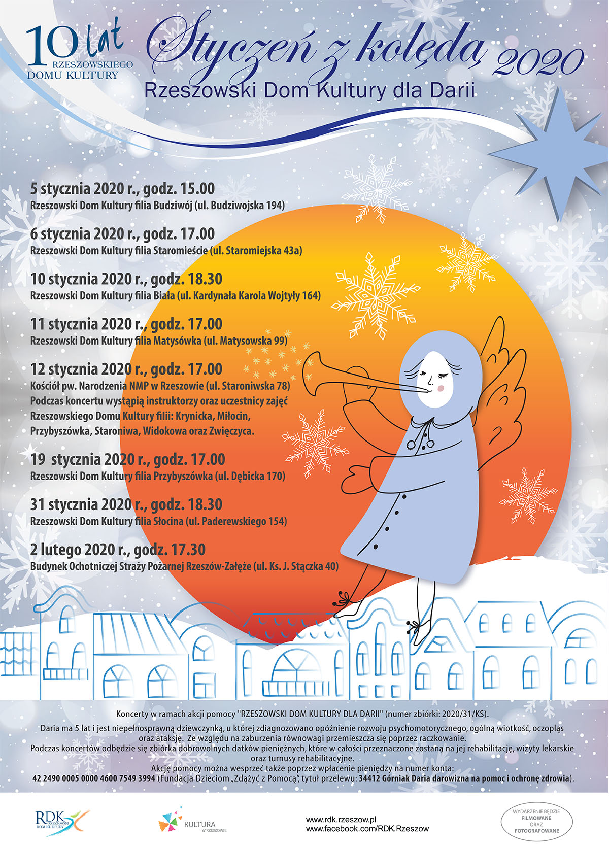 Styczeń z kolędą” to cykl  bezpłatnych koncertów, podczas których instruktorzy i członkowie zajęć muzycznych z rzeszowskich domów kultury w towarzystwie zespołów śpiewaczych zaprezentują najpiękniejsze kolędy i pastorałki bożonarodzeniowe. Nie zabraknie również pokazów tanecznych i występów chórów dziecięcych. Podczas koncertów będą też zbierane pieniądze na pomoc 5-letniej Darii z Rzeszowa. Akcja rozpocznie się już w najbliższą niedzielę, 5 stycznia i potrwa do 2 lutego.