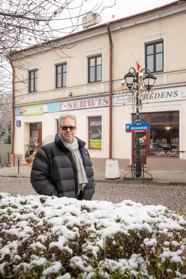 Sławomir Gibała przed kamienicą w grudniu 2020 roku. W miejsce Gibsportu powstał Kredens. Fot. Tadeusz Poźniak