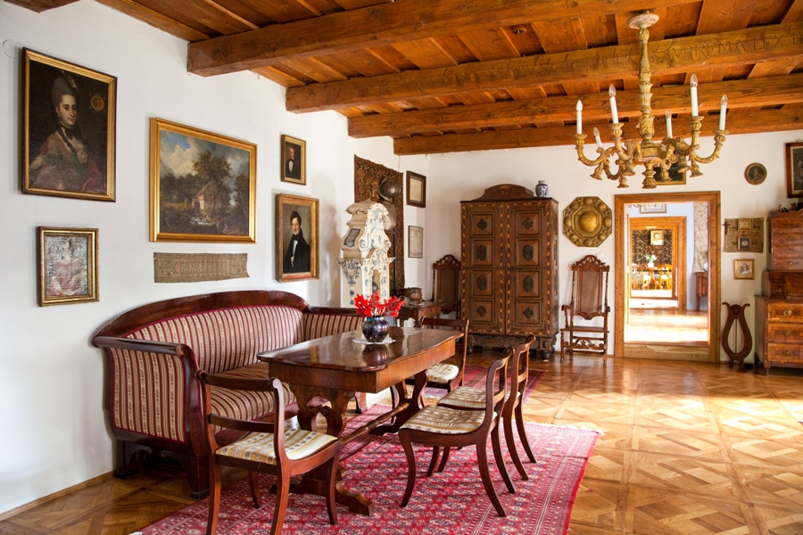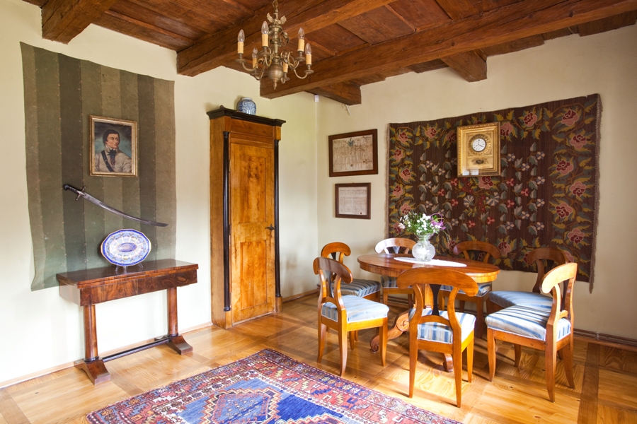 Wchodząc przez zacieniony ganek widzimy amfiladę pokoi, przez którą jednym rzutem oka obejrzeć możemy całe wnętrze. W ostatnim pokoju płytka niby-szafka intarsjowana czarnym dębem. Zamiast okucia ma klamkę: w rzeczywistości mebel kryje w sobie tajne przejście prowadzące do kuchni i spiżarni. W tej ostatniej ocalało oryginalne okno z początku XIX w. To niezwykła rzadkość – powód wizyt specjalistów od historii wnętrz. Jest jeszcze druga amfilada – równoległa do pierwszej, która z bocznego salonu i sypialni prowadzi do pomieszczeń gospodarczych.