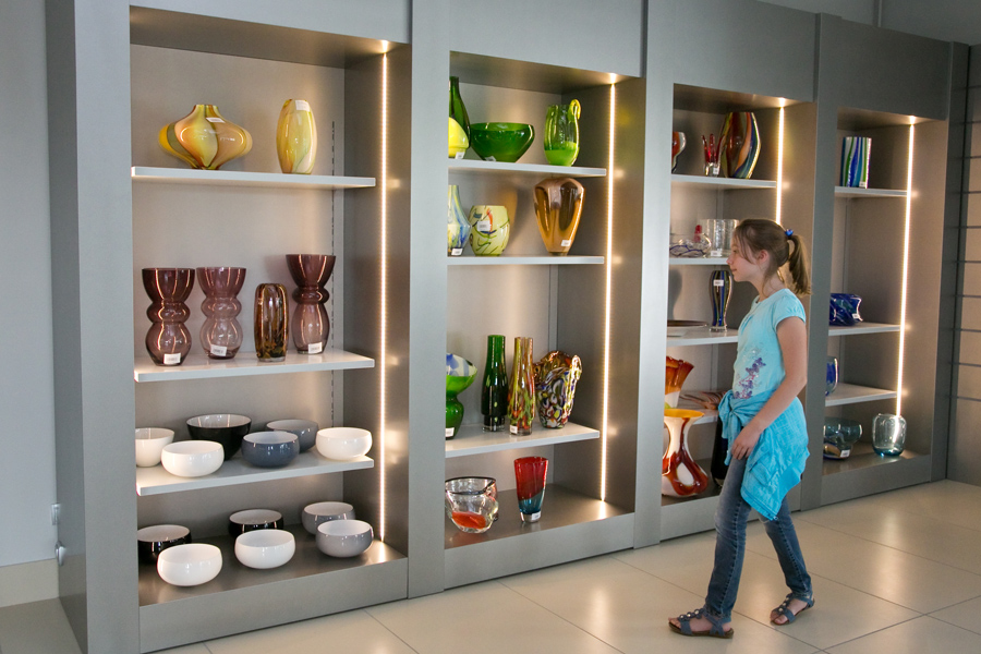 Turyści prowadzeni są następnie do warsztatów, gdzie odbywa się wykańczanie wyrobów. To mylące określenie, bo właściwie w tym dziale następuje ich kreowanie. Z różnokolorowych cieniutkich rurek podgrzewanych palnikiem formowane są niewielkie zwierzątka – najmniejsze wielkości guzika. Szklarz-artysta nadaje miniaturkom indywidualny wyraz. Przy innym warsztacie pracownica maluje na różnokolorowych bańkach pejzaże tak misternie, iż szkoda narażać je na stłuczenie wieszając na choince. Lepiej eksponować je na specjalnym drucianym stojaku. Grawer przenosi na szklaną powierzchnię reprodukcję konnego portretu Józefa Piłsudskiego pędzla Wojciecha Kossaka, którą następnie utrwala za pomocą precyzyjnych rylców. Drobne detale nanosi za pomocą wierteł dentystycznych. W dziale witraży kolorowe płytki spajane są tradycyjnie za pomocą ołowiu lub metodą Louisa C. Tiffany'ego (1848-1933), amerykańskiego projektanta, który w okresie secesji zrewolucjonizował sztukę dekoracyjną. Wedle jego wskazań szklane płytki owijane są taśmą miedzianą i spajane za pomocą cyny. Pozwala to na tworzenie witraży przestrzennych np. abażurów do lamp.