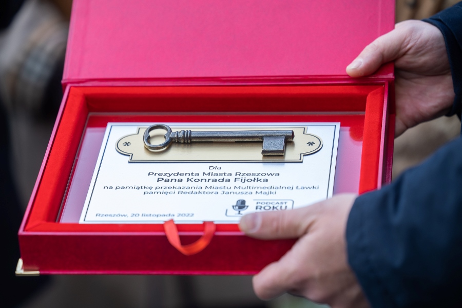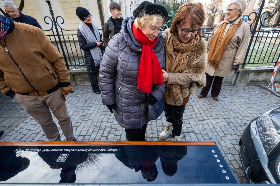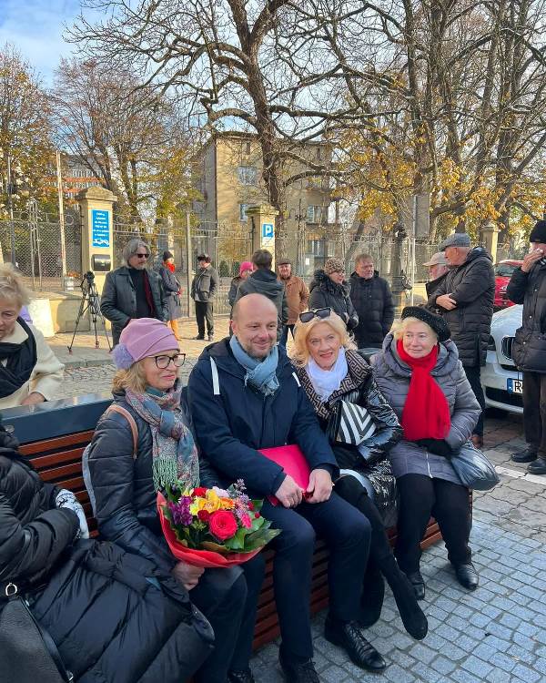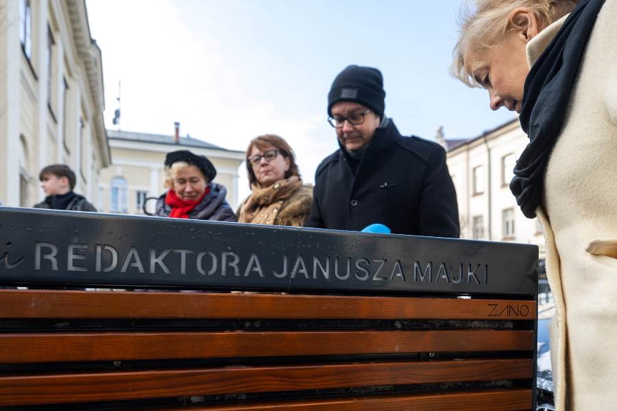 Rodzina śp. Janusza Majki na ławce solarnej Jego pamięci. Fot. Grzegorz Bukała/ Urząd Miasta Rzeszowa
