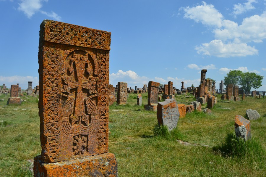 Mijam ogromne jezioro Sewan - kawałek nieba, które zstąpiło między góry - jak pisał Maksym Gorki, w drodze do Noratus, gdzie na wielkim polu od wieków stawiano chaczkary, kamienne krzyże, najważniejszy symbol Armenii. Jest ich tam 900, milczących, wpatrzonych w góry, bronią swoich panów i terenów.