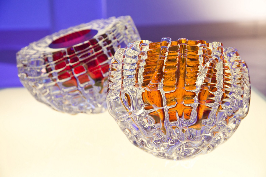 Oto kilka przykładów z krośnieńskiej wystawy. Zamknięta w owalu, oszczędna w wyrazie, abstrakcyjna forma rzeźby z przeźroczystego szkła jest dziełem Kazushi Nakada z Finlandii.  W pracach Remigijusa Kriukasa (Litwa) ta forma przeobraża się w kamienie i krater z odległej planety – z Marsa. Vladimir Klein (Czechy) obrabia bryły szkła tak, jak rzeźbiarz kształtuje bryłę marmuru: za pomocą młotka i dłuta. Wyczarowuje z niej subtelne kształty będące aluzją do  bezkresnego oceanu. Alexandru Ghildus z Rumunii wykreował szklane pantofelki z bajki o Kopciuszku. Popatrzcie, w jak zaskakującym miejscu je ustawił.  Beata Damian-Speruda (Polska) w szklanych naczyniach umieszcza naszyjniki z leśnych owoców oraz pęki traw tworząc osobliwą kolekcję. Wspaniałe są bajecznie kolorowe dziecinne zabawki Nicolasa Morin (Francja), Andrija Bokoteja (Ukraina), Pati Dubiel i Pawła Borowskiego (oboje w Polski). Zresztą zobaczcie sami. Naprawdę warto!