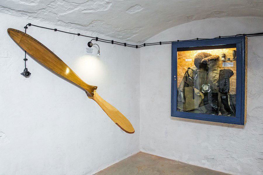 Zwiedzanie Muzeum - po którym oprowadza mnie Lesław Wilk - rozpoczyna się od schronu przeciwlotniczego, znajdującego się pod budynkiem należącym dawniej do lotniska. Przed wybuchem II wojny światowej krośnieński garnizon lotniczy miał aż trzy lotniska - główne w Krośnie, oraz dwa pomocnicze: w Krościenku Wyżnym i w Moderówce. Funkcjonowała tutaj, przeniesiona w listopadzie 1938 r. z Bydgoszczy i Świecia, trzyletnia Szkoła Podoficerów Lotnictwa dla Małoletnich. W budynkach koszarowych dla 600 uczniów zakwaterowano dwa ostatnie roczniki. Pierwszy rekrutowano tuż przed wybuchem wojny, w oparciu o przeniesione także tutaj Centrum Wyszkolenia Lotnictwa nr 2. Szkoła kształciła pilotów, strzelców pokładowych, radiotelegrafistów i mechaników lotniczych. W 1939 r. do pułków lotniczych odszedł pierwszy rocznik absolwentów. Po niemieckich bombardowaniach lotniska w Krośnie Szkołę ewakuowano w kierunku Łucka na Wołyniu. Część z nich walczyła z Sowietami. Inni przez Rumunię i Francję przedostali się do Anglii zasilając polskie dywizjony. W samym tylko Dywizjonie 300 walczyło 28 absolwentów SPLdM; żaden nie przeżył wojny.
