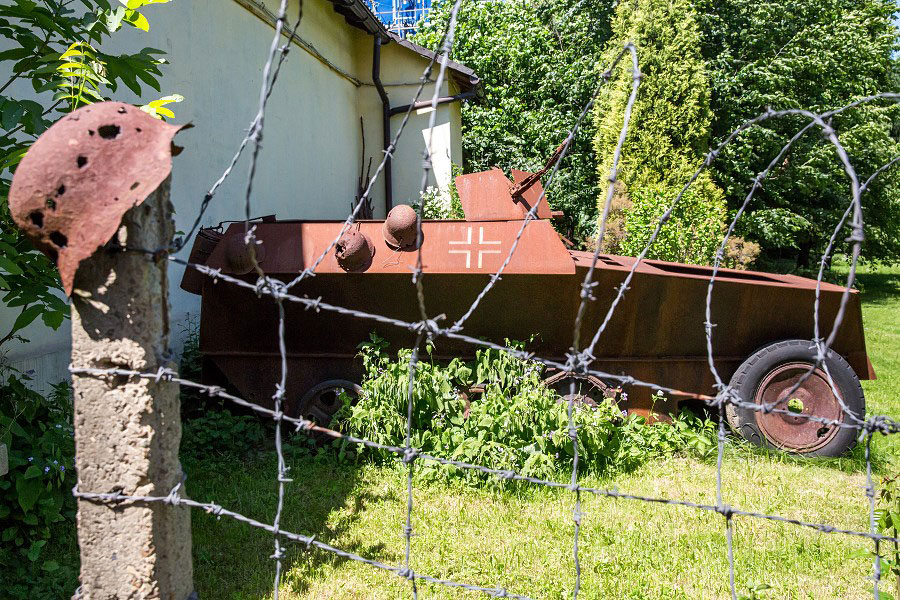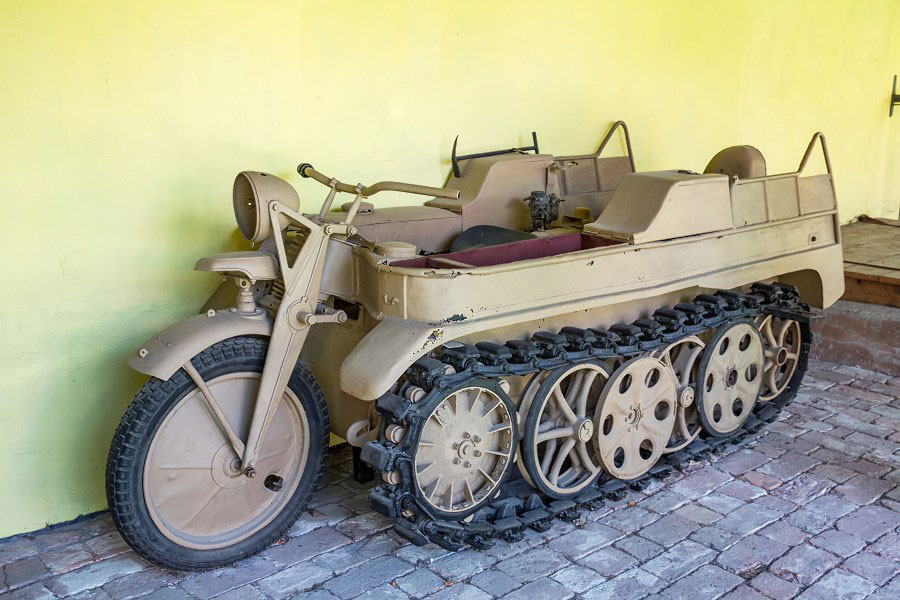 Po wyjściu ze schronu w przymuzealnym ogródku oglądamy inną osobliwość: półgąsienicowy niemiecki pojazd Kettenkrad HK-101. Niewielki, zwrotny z przodu przypomina motocykl, z tyłu - miniaturkę czołgu. Specjalne, szerokie gąsienice pozwalały mu poruszać się po bagnach i po kopnym śniegu. Służył jako lekki ciągnik dla niemieckich wojsk, rozwijając prędkość do 70 km/godz. Na drodze zużywał 16 litrów paliwa na 100 km, w terenie - 22 l. Zdobytych na Niemcach egzemplarzy (a wyprodukowano ich tylko siedem tysięcy) chętnie używały zarówno wojska angielskie i amerykańskie, jak i sowieckie. Po wojnie posłużył jako wzór do skonstruowania skuterów śnieżnych. Krośnieński pojazd przez kilkadziesiąt lat przeleżał porzucony w bieszczadzkim lesie. Jego rekonstrukcja i konserwacja trwała 13 lat. Na odnowienie czeka w pobliżu inny niemiecki półgąsienicowy transporter opancerzony. Pojazd jest w dużej części już skompletowany: zachowały się oba przednie koła, część kół podwozia gąsienicowego oraz opancerzona wieżyczka z karabinem maszynowym.