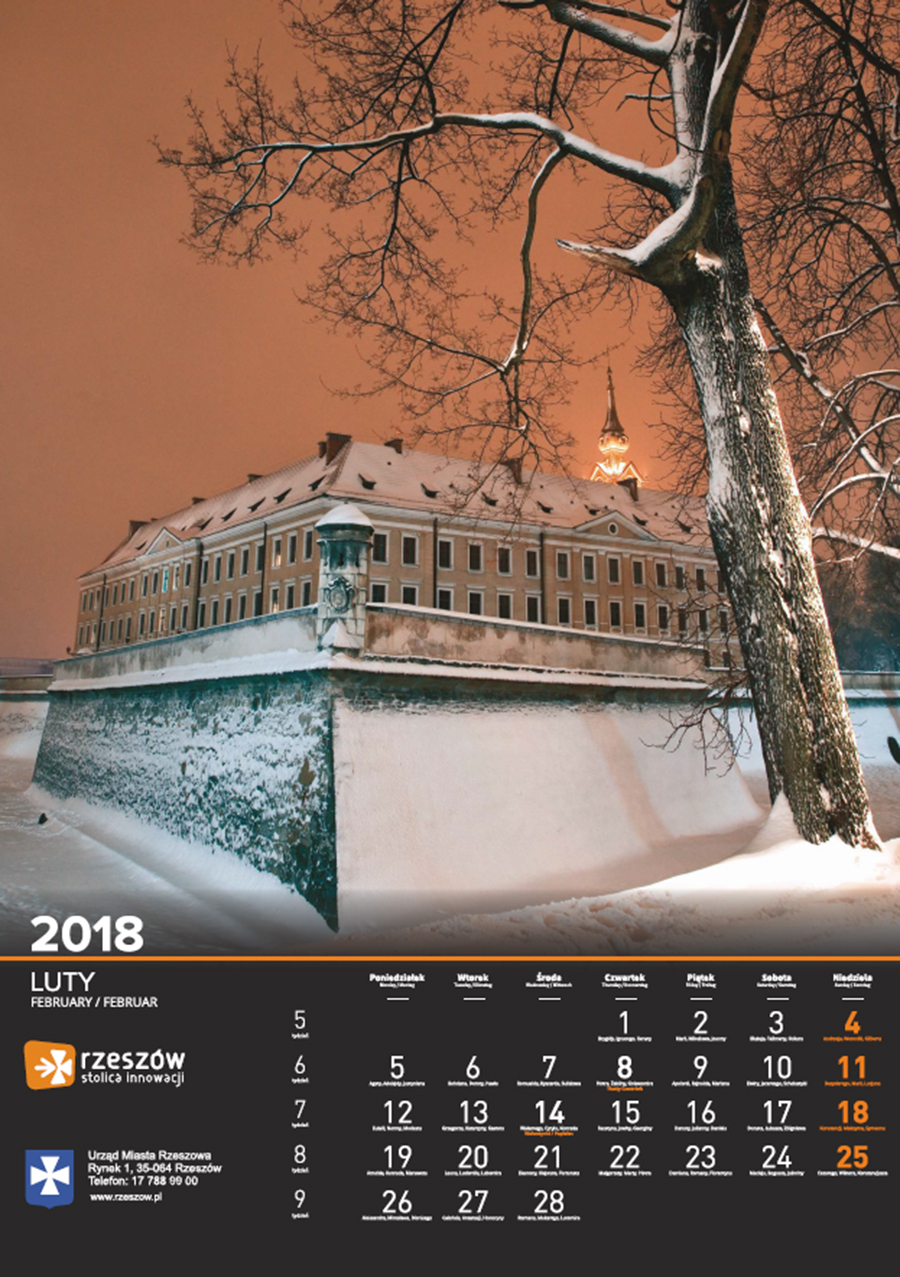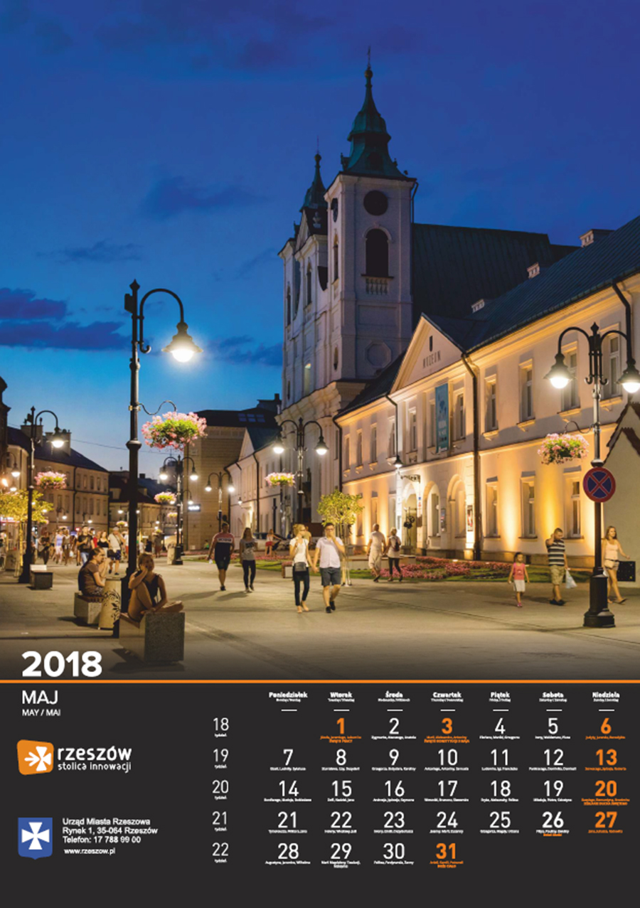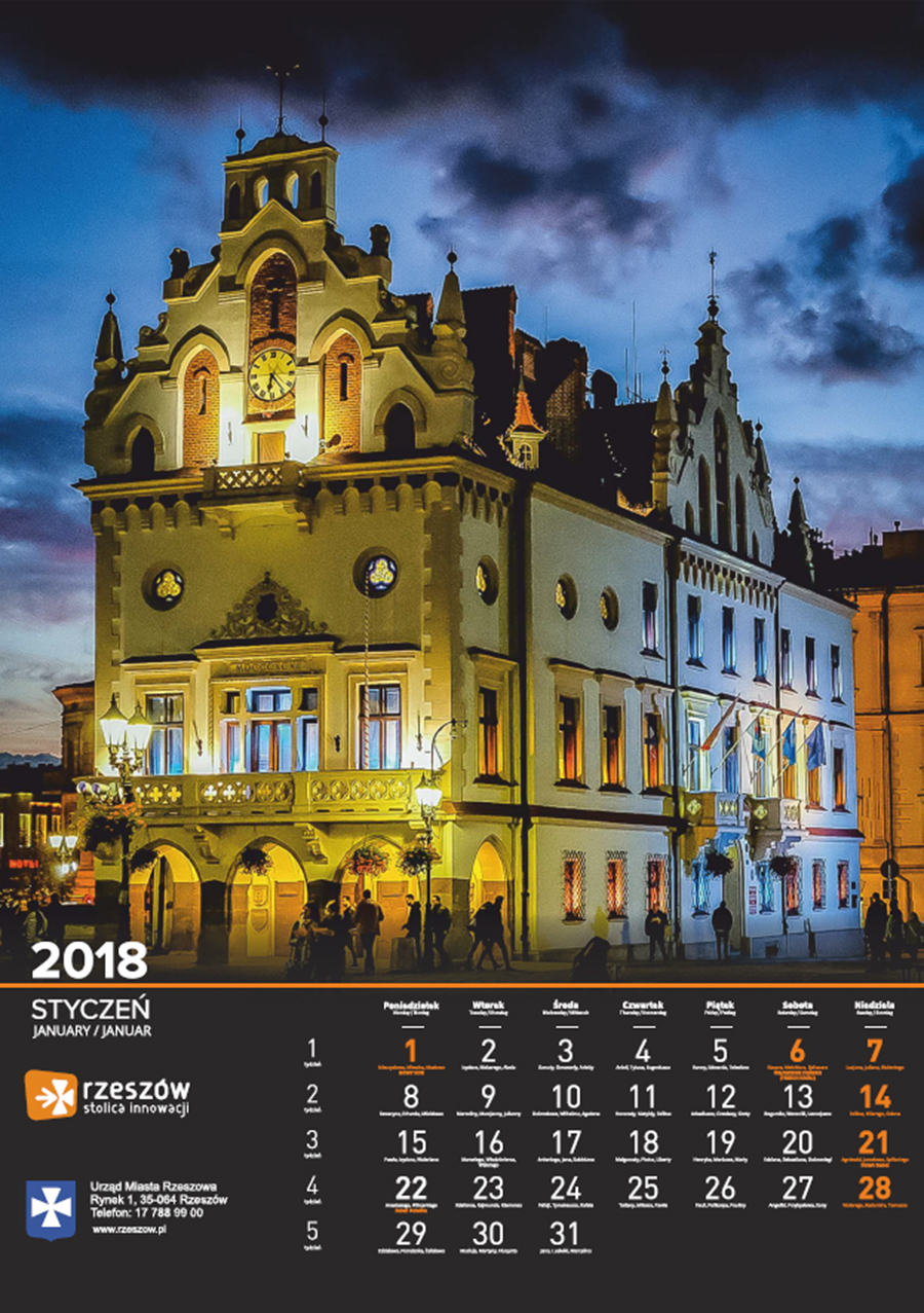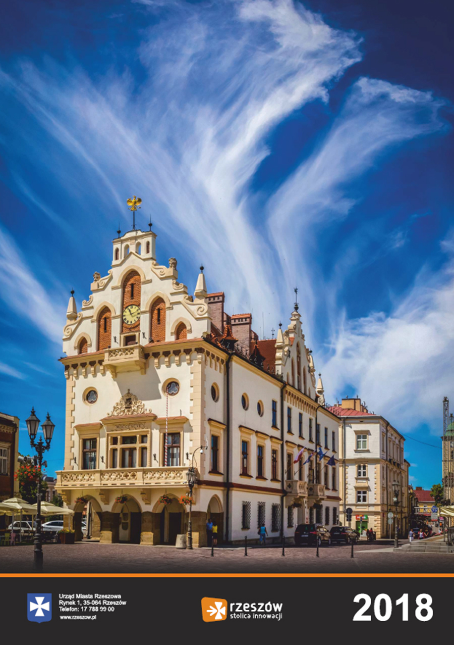 Każdego roku Urząd Miasta Rzeszowa przygotowuje kalendarz z pięknymi zdjęciami stolicy Podkarpacia. Na kalendarzu na 2018 rok widnieją zdjęcia charakterystycznych dla miasta miejsc oraz wydarzeń. Są to m.in. oświetlony ratusz na tle nieba spowitego ciemnymi chmurami, Zamek Lubomorskich w bajkowej, zimowej scenerii; wieczorne zdjęcia kościoła farnego i Paniagi, aleja Lubomirskich, fontanna multimedialna, ogrody bernardyńskie, skatepark na Podpromiu czy koncert Europejskiego Stadionu Kultury.