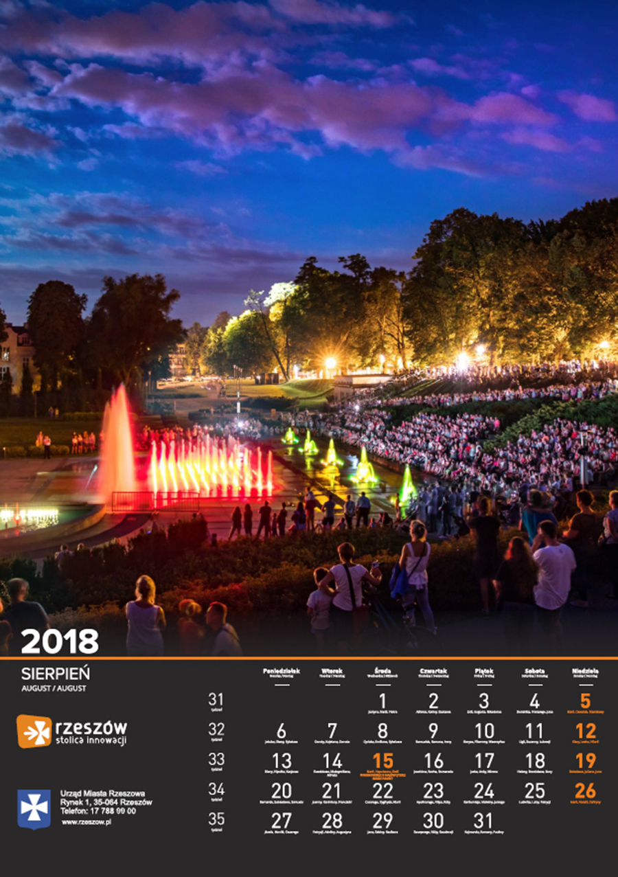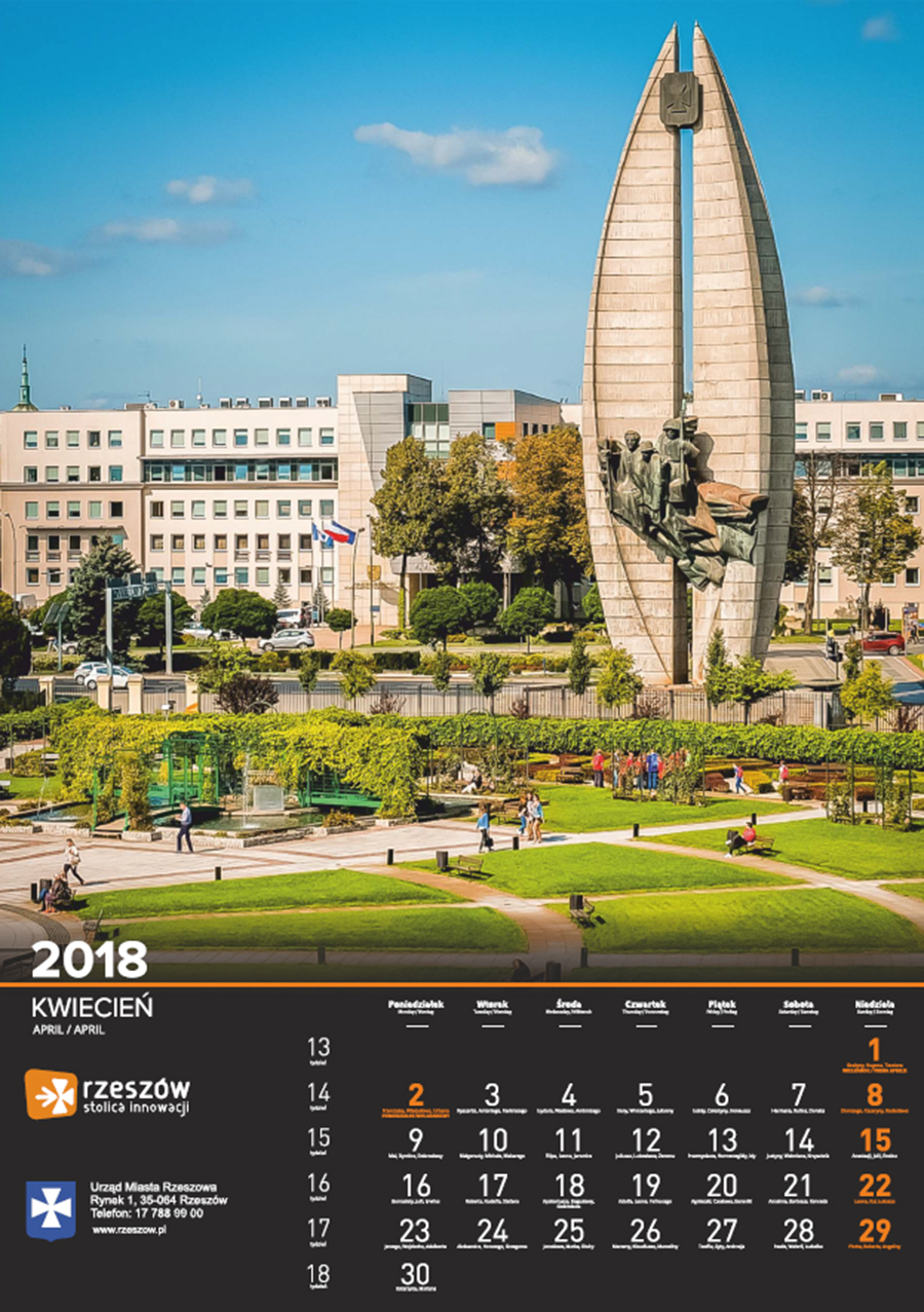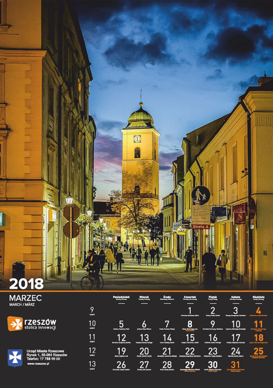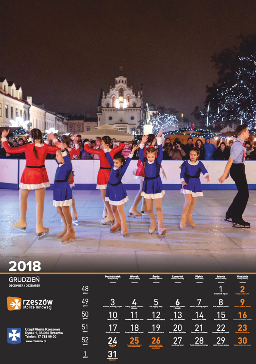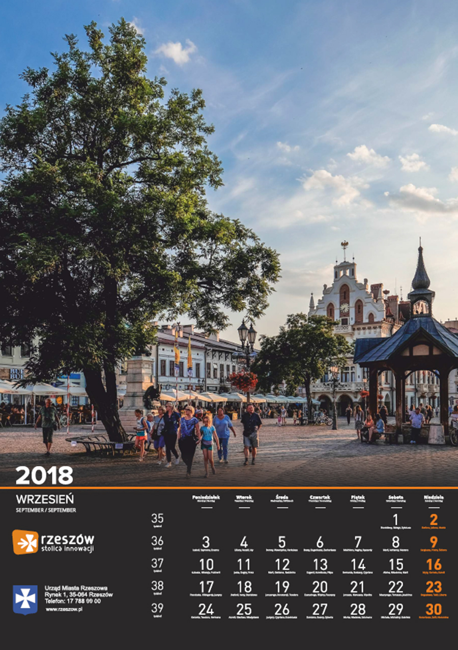 Każdego roku Urząd Miasta Rzeszowa przygotowuje kalendarz z pięknymi zdjęciami stolicy Podkarpacia. Na kalendarzu na 2018 rok widnieją zdjęcia charakterystycznych dla miasta miejsc oraz wydarzeń. Są to m.in. oświetlony ratusz na tle nieba spowitego ciemnymi chmurami, Zamek Lubomorskich w bajkowej, zimowej scenerii; wieczorne zdjęcia kościoła farnego i Paniagi, aleja Lubomirskich, fontanna multimedialna, ogrody bernardyńskie, skatepark na Podpromiu czy koncert Europejskiego Stadionu Kultury.