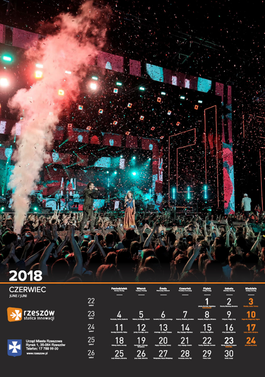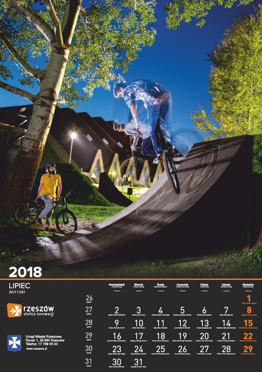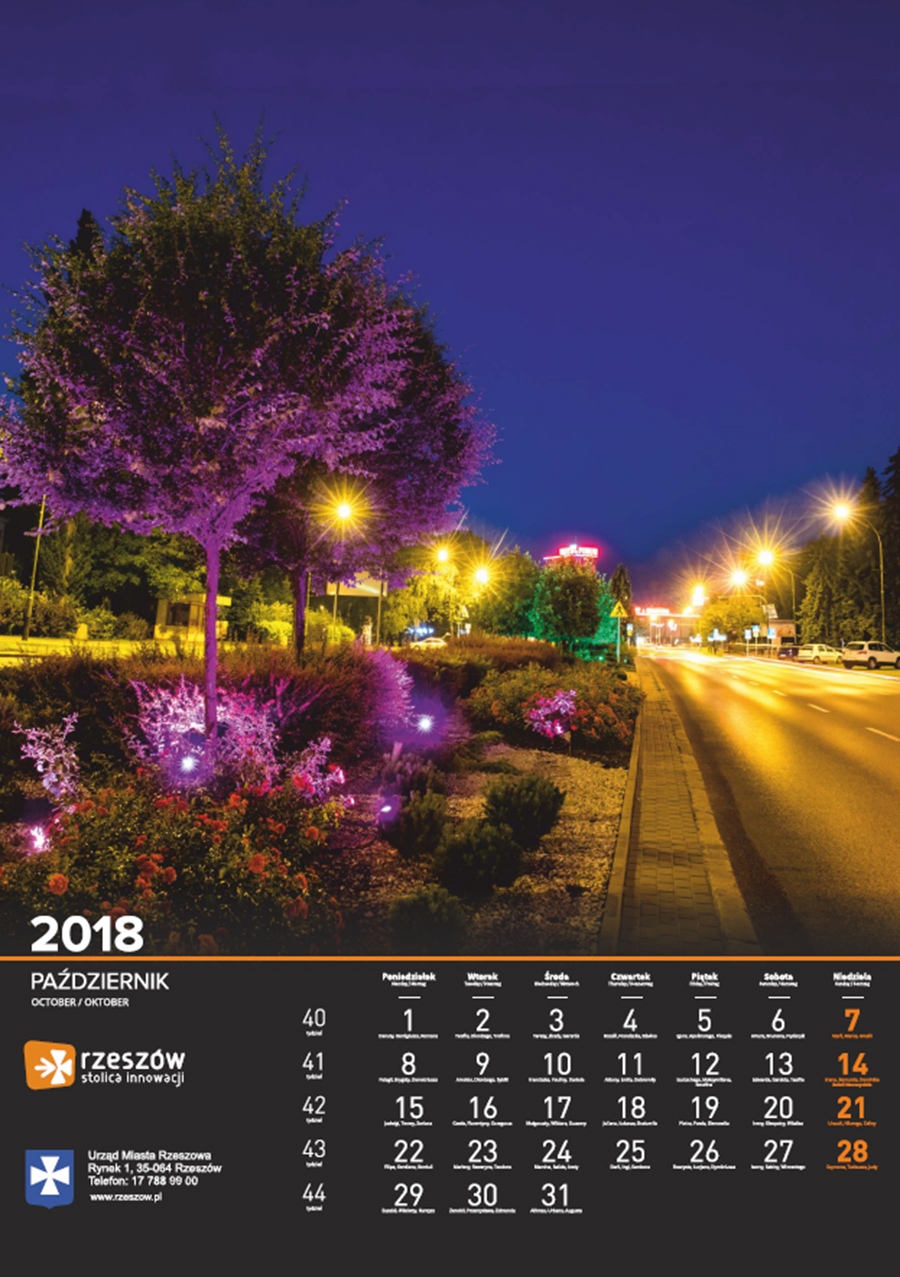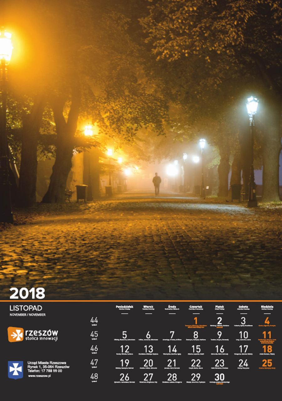 Każdego roku Urząd Miasta Rzeszowa przygotowuje kalendarz z pięknymi zdjęciami stolicy Podkarpacia. Na kalendarzu na 2018 rok widnieją zdjęcia charakterystycznych dla miasta miejsc oraz wydarzeń. Są to m.in. oświetlony ratusz na tle nieba spowitego ciemnymi chmurami, Zamek Lubomorskich w bajkowej, zimowej scenerii; wieczorne zdjęcia kościoła farnego i Paniagi, aleja Lubomirskich, fontanna multimedialna, ogrody bernardyńskie, skatepark na Podpromiu czy koncert Europejskiego Stadionu Kultury.