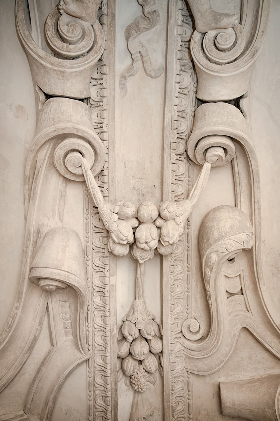 Sztukaterie w Krośnie stanowią eleganckie ramy dla rodowych portretów. Nad każdym z nich umieszczono bogate tarcze herbowe. Wyżej widnieje fryz z panopliów - tak aktualny w pełnej wojen epoce. Oglądamy na fryzie armaty spoczywające na lawetach, kule, beczki z prochem - na wojskowych bębnach skończywszy. To aluzja do „rycerskich przewag” Stanisława.
