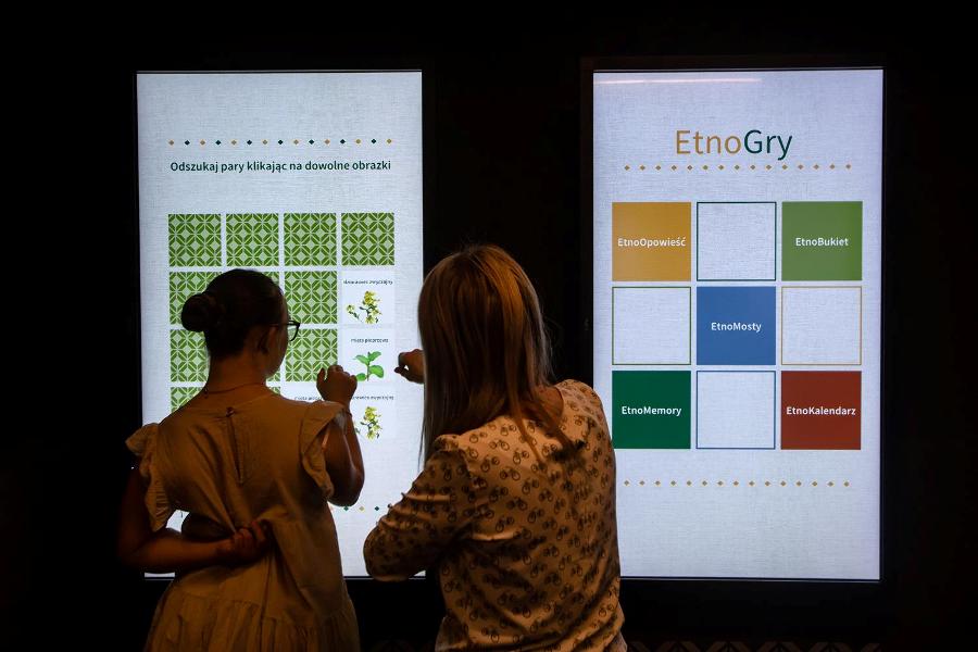 Nie znaczy to, iż w Etnocentrum zrezygnowano z nowoczesności. Przeciwnie: siedząc na drabiniastym wozie można dzięki możliwościom projekcji 3D obejrzeć animowane, interaktywne legendy krośnieńskie opowiadane przez pochodzącego z Krosna znanego aktora Roberta Rozmusa. W kuchni z ogromnym tradycyjnym piecem kaflowym zamontowano stół multimedialny, na którym wyświetlana jest atrakcyjna animacja ilustrująca proces powstawania tradycyjnych potraw. Znalazła się tam również multimedialna książka kucharska. Z kolei w warsztacie tkackim mieści się stół multimedialny, na którym można zaprojektować, wykorzystując wybrany przez siebie rodzaj haftu, własną serwetkę.