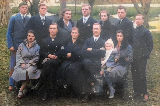 Szopowie w domowym ogrodzie w Przemyślu w 1932 r. Władysław w marynarskim mundurze drugi od lewej w dolnym rzędzie. Fot. Archiwum Rodziny Szopów