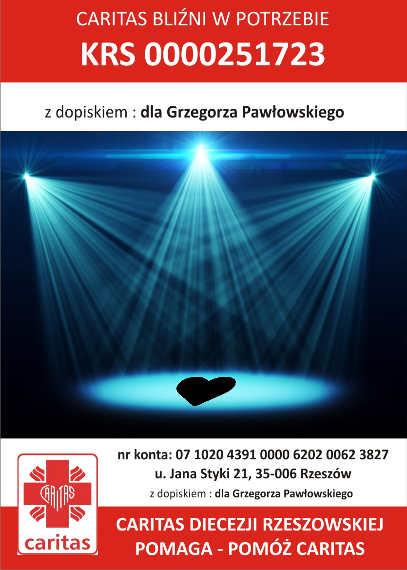 Dzięki Caritas Diecezji Rzeszowskiej na rehabilitację Grzegorza można przekazać 1% podatku. Aktor serdecznie dziękuje ofiarodawcom i wszystkim życzliwym osobom, które wspierają go duchowo.