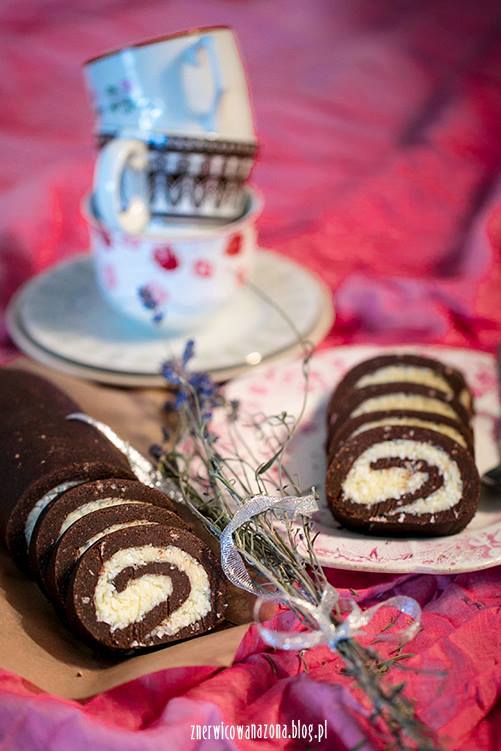 Tym razem będzie coś o złych wyborach… Często robię ciasta z masą na bazie śmietanki kremówki i mascarpone. Są pyszne i lekkie w przeciwieństwie do mas typu budyń + masło. Jednak szukając odskoczni od przygotowywanych przeze mnie wypieków, wpadłam na pomysł by zrobić jakiś mega zapychacz. Znalazłam przepis na roladę z dużą zawartością cukru i ciężką masą. Brzmi kiepsko? A jak napiszę, że masa jest mocno kokosowa , zawiera kawałki kruchego herbatnika, a przygotowanie całości zajmuję kilka chwil? Moim zdaniem to rekompensuje ciężkość tego ciacha.