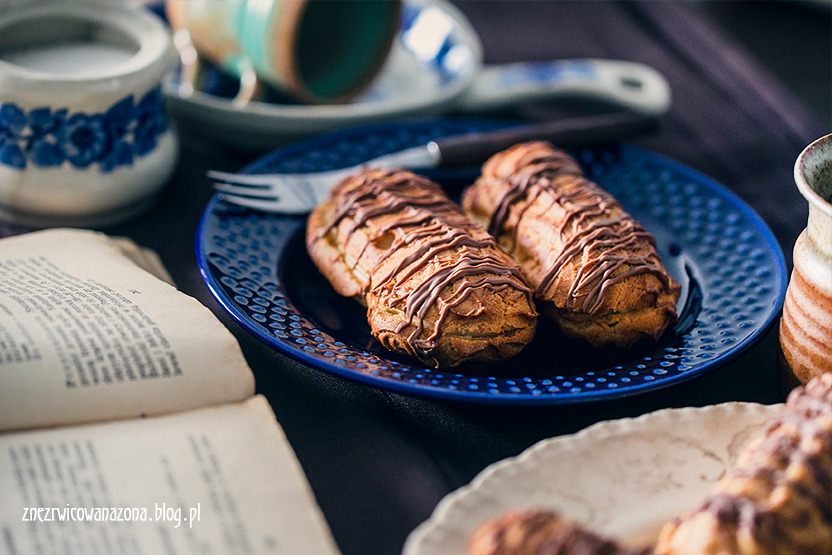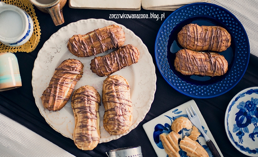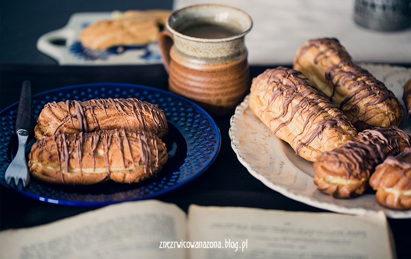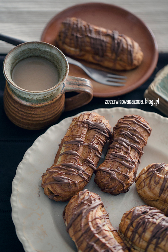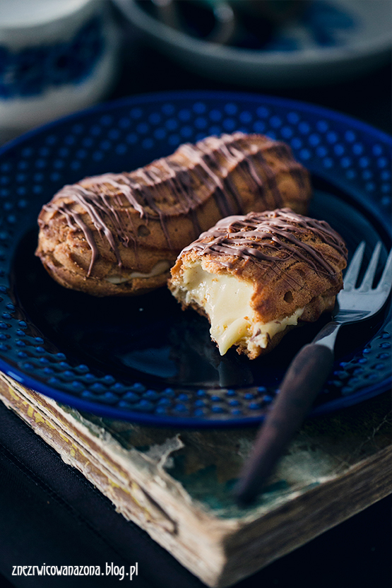 Nie tak dawno temu, będąc na zakupach, natrafiłam na eklera. Był piękny, z dużą ilością masy i polewy czekoladowej. Zazwyczaj nie kupuję takich wypieków, ale byłam oczarowana. W domu zrobiłam sobie kawę i zasiadłam z eklerem. Wystarczyła jedna łyżeczka kremu. Po spróbowaniu, całe nadzienie wylądowało w koszu. Zostało tylko ciasto, bo tylko ono było zjadliwe. To był ostatni raz kiedy kupiłam takie ciastko. Nie mówię, że wszystkie kupione są złe. Może ja tylko tak trafiłam. Szkoda pieniędzy na ciastka, które tylko ładnie wyglądają. Nadszedł więc czas, żeby spróbować swoich sił w przygotowaniu eklerów :)