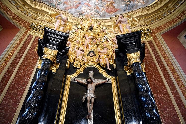 W ołtarzu na ramionach Krzyża rozpięta jest postać umęczonego Zbawiciela z twarzą zastygłą w cierpieniu. Krucyfiks powstał w XVI stuleciu. Umieszczony pierwotnie w kruchcie zachodniej cieszył się sławą cudownego i przyciągał rzesze wiernych. To dla wyeksponowania tego krucyfiksu wzniesiona została opisywana kaplica. U stóp Ukrzyżowanego eksponowane jest dzieło o równie wysokim poziomie artystycznym. To rzeźbiona w alabastrze Pieta z XVII w. sprowadzona z Niderlandów.