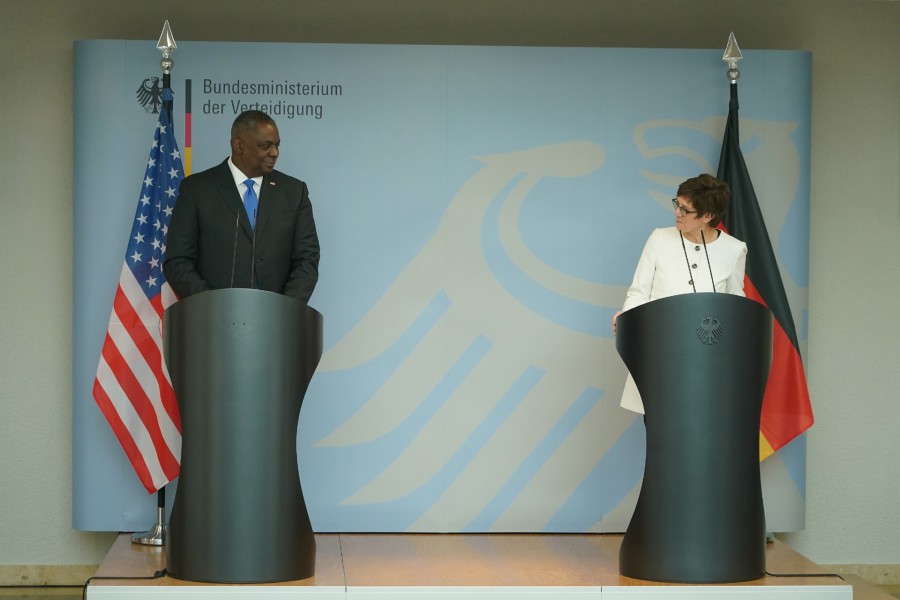 Minister obrony Niemiec Annegret Kramp-Karrenbauer i sekretarz obrony USA Lloyd Austin w Berlinie, 13 kwietnia 2021. Fot. Sean Gallup / POOL/PAP/EPA
