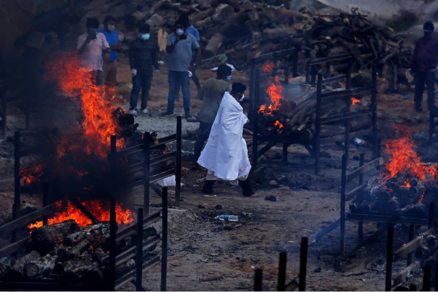 Pogrzebowe modlitwy za ofiary Covid-19 podczas masowej kremacji zwłok. Indie, 18 maj. Fot. JAGADEESH NV/EPA/PAP