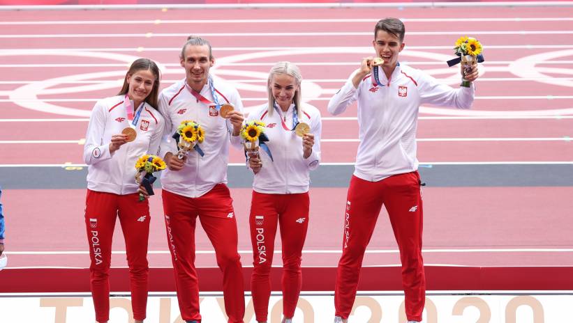 Karol Zalewski, Natalia Kaczmarek, Justyna Święty-Ersetic i Kajetan Duszyński, którzy pobiegli w finale, na Stadionie Olimpijskim w Tokio odebrali złote medale za sobotni triumf w sztafecie mieszanej 4x400 metrów. Po raz pierwszy w tych igrzyskach rozbrzmiał Mazurek Dąbrowskiego.