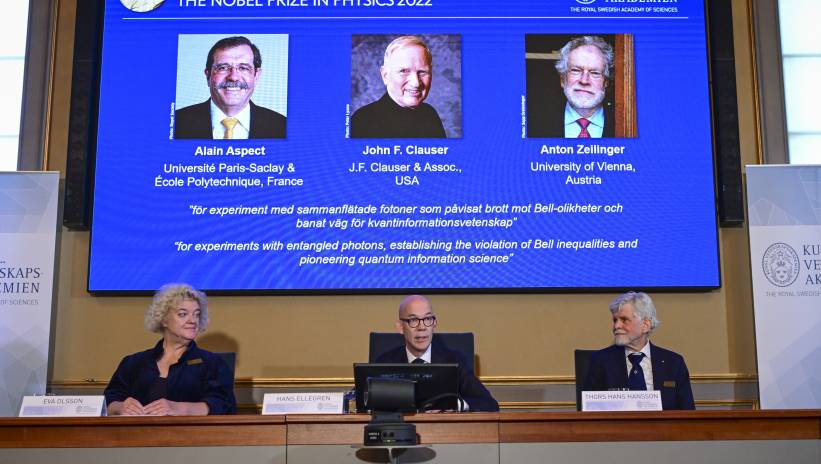 Laureaci tegorocznej nagrody Nobla w dziedzinie fizyki: Alain Aspect (Francja), John F. Clauser (USA) i Anton Zeilinger (Austria) przeprowadzili przełomowe eksperymenty z wykorzystaniem splątanych stanów kwantowych, w których dwie cząstki zachowują się jak pojedyncza jednostka, nawet gdy są rozdzielone. Wyniki utorowały drogę dla nowej technologii opartej na informacjach kwantowych.